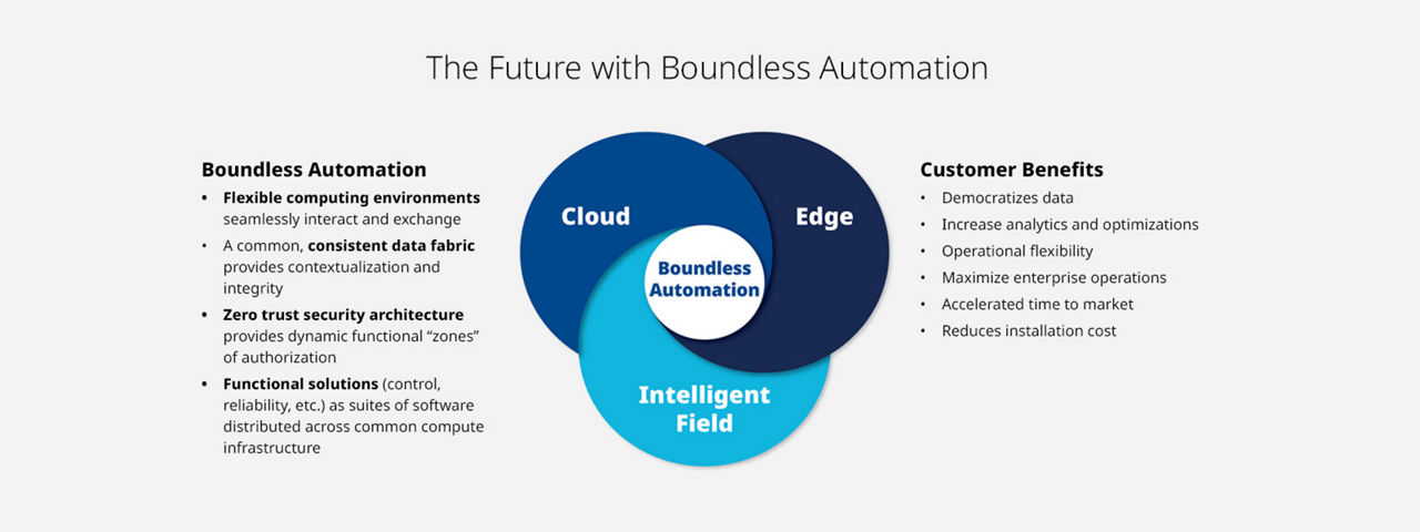Boundless Automation は、インテリジェントフィールド、エッジコンピューティング、クラウドを組み合わせ、安全で柔軟なソフトウェアプラットフォームを構築するという 3 つ組の戦略で、未来への歩みを加速します。 このシームレスなデータハイウェイにより、ソフトウェアアプリケーションは、スマート・フィールド・デバイス、高度なエッジコンピューティング、クラウドで直接実行できます。