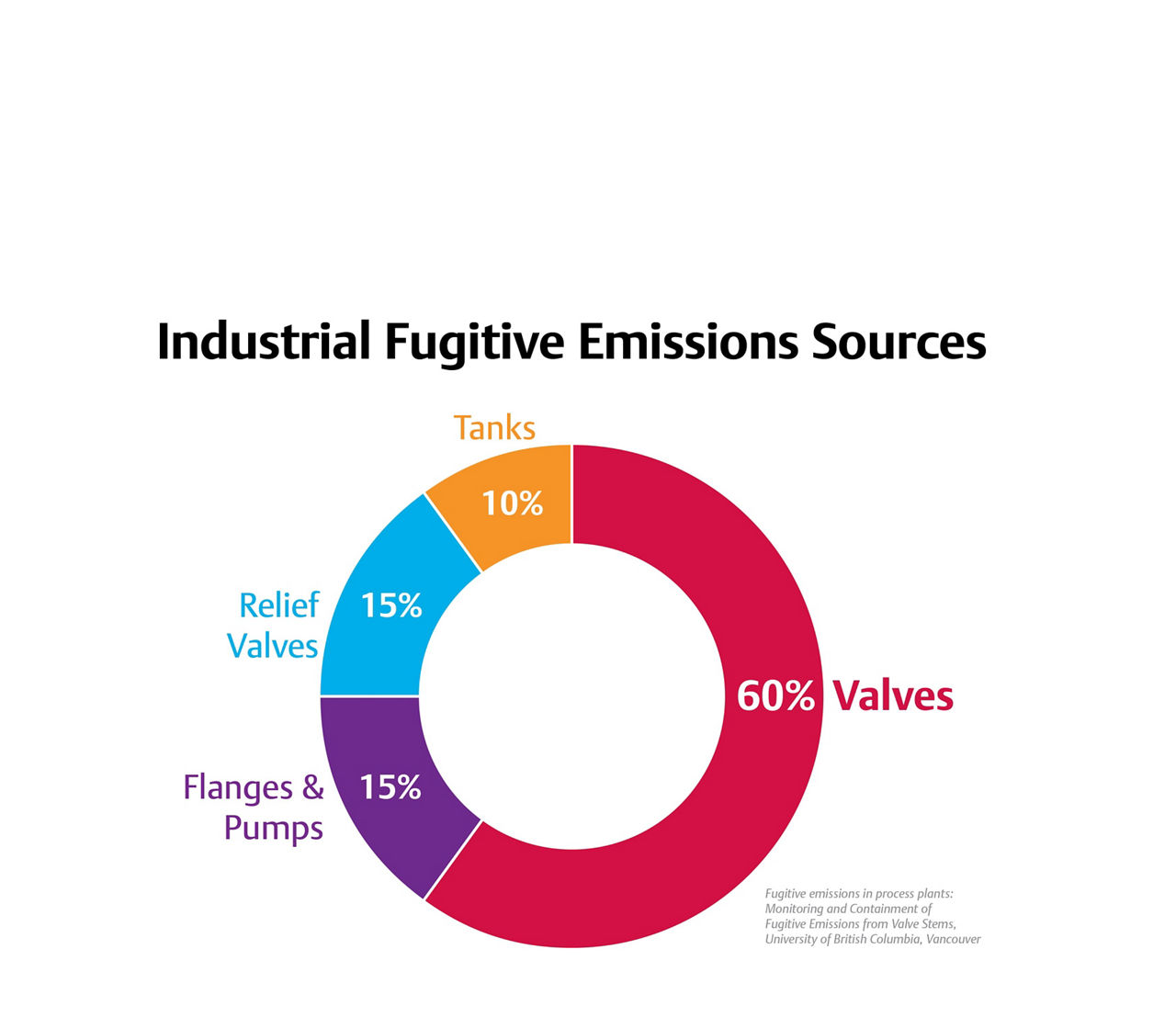 最も検出しにくい排出物の 1 つは、「フュージティブエミッション(漏洩排出物)」として知られています。これは、漏れやすいバルブやタンク、腐食した配管、あるいは機械的な接続不良により有毒ガスや有害な液体を封じ込めることができない場合に発生するものです。 真っ先に想起されるのは、地球温暖化の大部分を占める強力な温室効果ガスであるメタンです。 前向きに考えると、メタンガスの排出防止は、最も短期間かつ低コストで気候目標を達成する方法の 1 つです。 メタンガスやその他の工業漏洩排出物は、前触れもなく発生し、検出が遅れることも多いのですが、その最大の発生源は隠れているようで実は明白です。60% はバルブが発生源であり、次いでフランジとポンプ、圧力安全リリーフバルブおよびタンクと続きます。