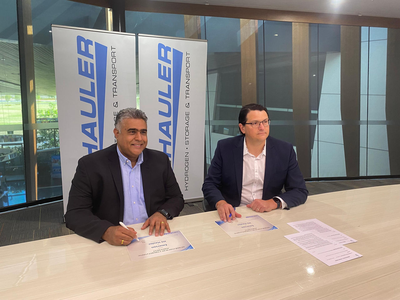 Emerson のオーストラリア・ニュージーランド担当バイスプレジデント Boris Gabin(左)が H2 Hauler CEO の Tyson Cooney 氏と共に、統合水素モビリティ技術を H2 Hauler に提供するための契約書に署名しました。 高解像度画像