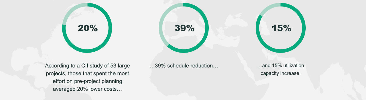 基本設計(FEED)は、プロジェクトの成功を導くための基準、役割と責任、仕様を確立することにより、プロジェクト戦略を明確で実用的な戦術に変換する重要なフェーズです。 適切に実行された FEED 計画は、詳細設計の主要な要素をすでに完了して文書化した上で、チームが調整され、準備されていることを保証します。